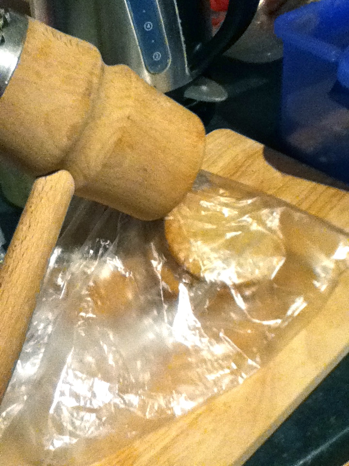 First you begin by bashing up digestive biscuits until they are like fine sand. (You can use a blender if you wish, but hitting them in a bag with a mallet is more satisfying, I find.)